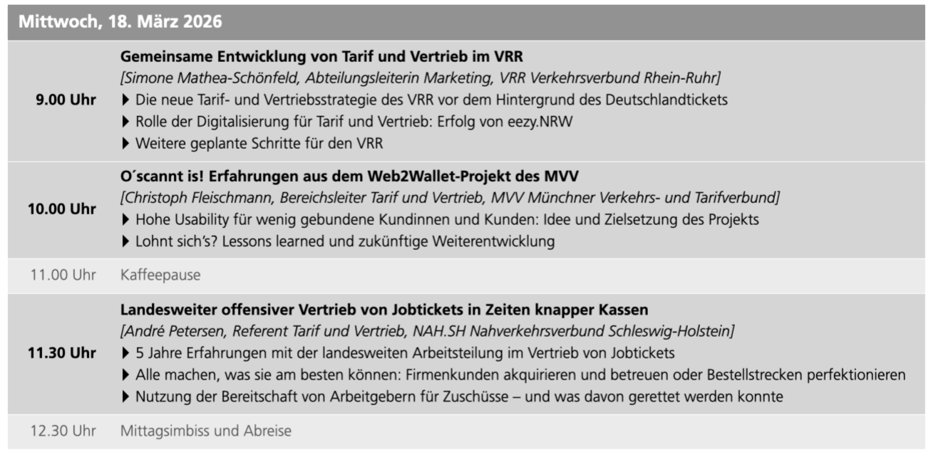 Für die ÖV-Verantwortlichen bedeutet das: Bestehende Konzepte müssen neu gedacht, Prioritäten geschärft und Ressourcen gezielt eingesetzt werden – um den Spagat zwischen Kundenorientierung und Kostendruck erfolgreich zu meistern. Welcher Vertriebsmix passt zu welchen Rahmenbedingungen? Wo lassen sich Prozesse verschlanken, ohne den Kundennutzen zu schmälern? Und wie kann der Vertrieb selbst zum Motor für Kundenzufriedenheit und Einnahmensicherung werden?