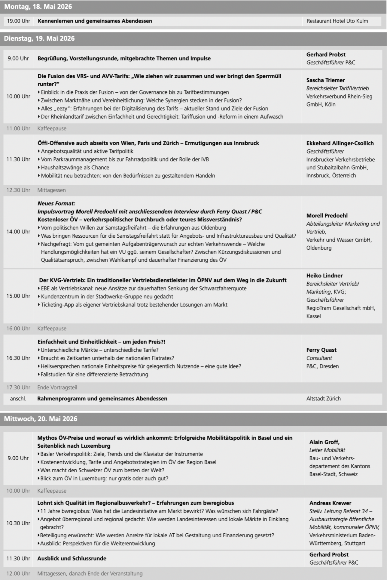 Die Teilnehmenden und Referenten kommen aus der Schweiz, Österreich und Deutschland, sowohl von Aufgabenträgern, Verkehrsunternehmen als auch von Verbünden, was erfrischende Perspektivwechsel verspricht.